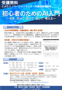 お知らせ とよたイノベーションセンター 初心者のためのAI入門講座開催 2023.07.05 この記事のタイトルとURLをコピーする とよたイノベーションセンターが主催する下記講座にて代表田村が講師を務めます。 本件は、とよたイノベーションとしても初開催となる新しいテーマの講座です。興味のある方は申込書でのお申し込み又は弊社までお知らせください。 令和5年度 『初心者のためのAI入門』(R5/8/8~ 全6回 開催)参加者募集中!